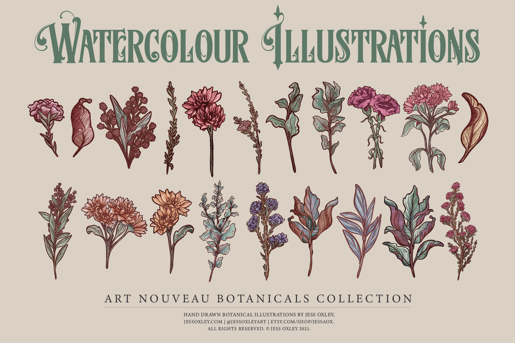 I created this beautiful Art Nouveau Botanicals Illustration set using Procreate on my Apple iPad Pro and edited with Adobe Illustrator and Photoshop to bring you high quality digital illustrations for you to use within your projects. Each illustration is saved as a PNG file, EPS file and an AI file which gives you complete editability and customisation.